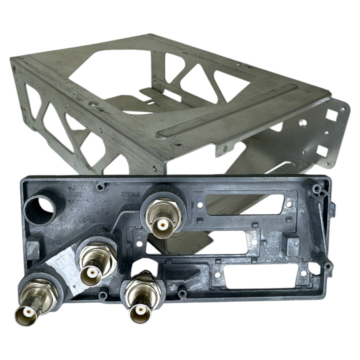 Suporte metálico de alta resistência, projetado para acomodar e fixar com segurança os rádios de navegação e comunicação Garmin GNS 400 e GNS 430 em painéis de aeronaves. Possui design modular, compatível com padrões aeronáuticos, garantindo encaixe preciso e rápida instalação.